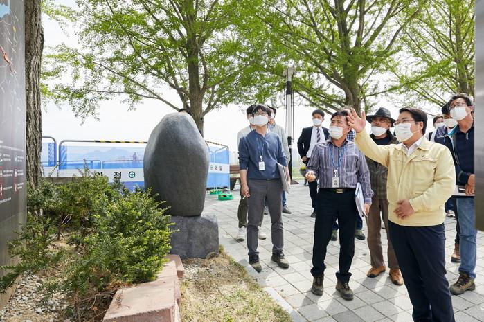 오세현 충남 아산시장이 22일 지난해 조성된 이순신 백의종군 '孝의 길'(2구간)을 찾아 각종 시설물 점검 등 현장 중심의 행정을 펼쳤다. 이날 현장 점검에는 향토사학자 천경석씨와 백의종군보존회장 박승운씨가 함께 동행하며 역사적 고증에 관한 안내와 설명을 했다. 사진은 오 시장(앞줄 오른쪽)이 관계자들과 현장 시설물을 둘러보는 모습. (사진제공=아산시청)