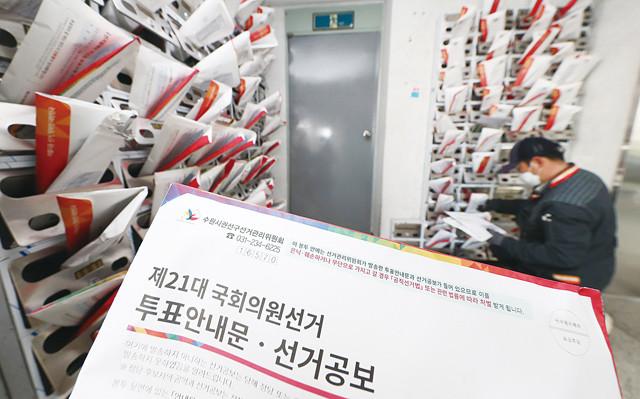 5일 오전 경기도 수원시의 한 아파트 단지에서 집배원이 제21대 국회의원선거 공보물을 각 가정 우편함에 배달하고 있다.