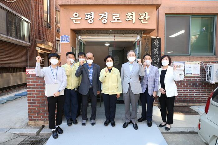 김미경 서울 은평구청장은 최근 대한노인회 은평구지회와 은평 춘당 현장을 방문해 코로나19 상황에서 노고가 많은 직원들을 격려했다. 사진은 대한노인회를 방문한 김 구청장(가운데)이 관계자들과 기념촬영을 하는 모습. (사진제공=은평구청)
