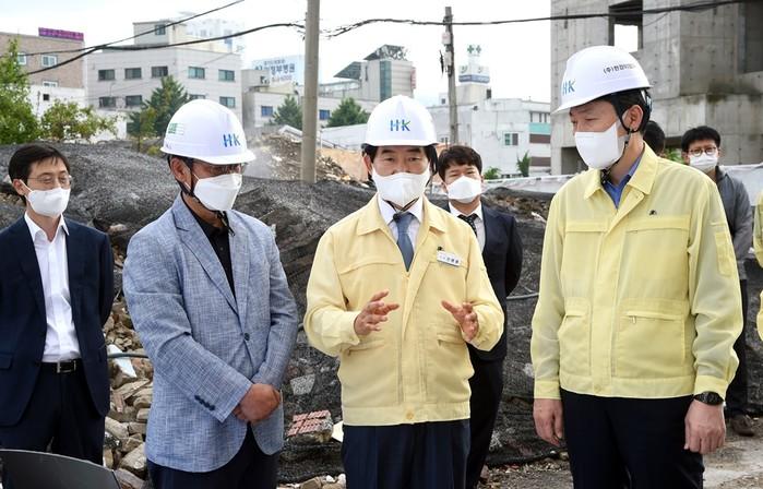 경기 의정부시가 최근 광주광역시에서 발생한 건물 붕괴사고와 관련해 지난 18일 철거·해체작업이 진행되고 있는 의정부동지역주택조합 지구에 대한 긴급안전점검을 실시했다. 이날 점검에서는 해체계획서에 맞는 해체공법과 작업수칙 준수 여부 및 공사장 주변 위험요소 등을 중점적으로 확인했다. 사진은 안병용 시장(가운데) 관계자들과 현장을 살펴보고 있는 모습. (사진제공=의정부시청)