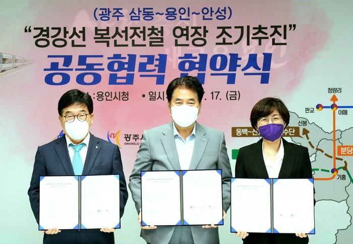 경기 광주시가 최근 용인시·안성시와 경강선 연장(광주~용인~안성) 철도건설 추진을 위한 공동협력 협약을 체결했다. 3개시는 경강선 연장 철도건설 추진을 위한 제반사항 합의에 적극 협력하고 사업이 조기 추진될 수 있도록 관계기관에 공동 건의키로 했다. 사진은 협약 체결 후 (왼쪽부터) 신동헌 시장과 백군기 용인시장, 김보라 안성시장이 기념촬영을 하고 있는 모습. (사진제공=광주시청)