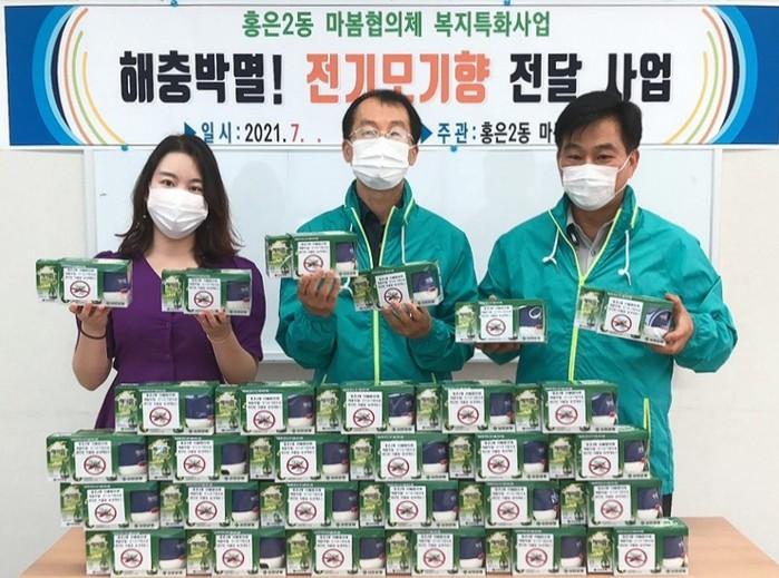 서울 서대문구 홍은2동 마봄협의체는 최근 여름철을 맞아 지층이나 옥탑에 거주해 해충에 취약한 저소득가정 50곳에 전기모기향(전기 훈증기·리퀴드 제품)을 전달했다. 사진은 전달식에서 관계자들이 기념촬영을 하는 모습. (사진제공=서대문구청)