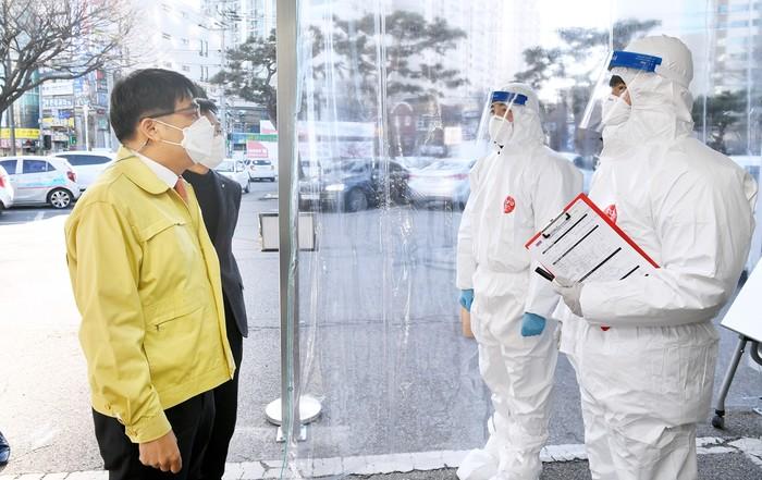 이석범 경기 광주부시장이 지난 15일 코로나19 장기화로 어려움을 겪고 있는 경안전통시장을 찾아 소상공인들을 위로하고, 보건소를 방문해 감염확산 방지를 위해 사투를 벌이고 있는 직원들을 격려했다. 사진은 이 부시장(왼쪽)이 보건소에서 직원들과 대화를 나누고 있는 모습. (사진제공=광주시청)