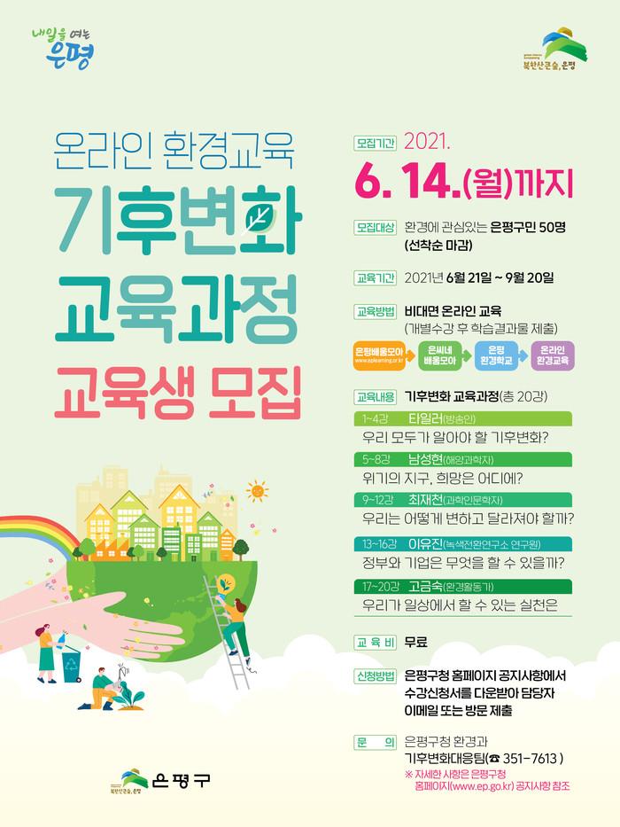[시민일보 = 이대우 기자] 서울 은평구(구청장 김미경)가 6월 기후위기 대응 및 탄소중립 실천을 위한 온라인 환경교육 ‘기후변화 교육과정’을 운영한다고 밝혔다.