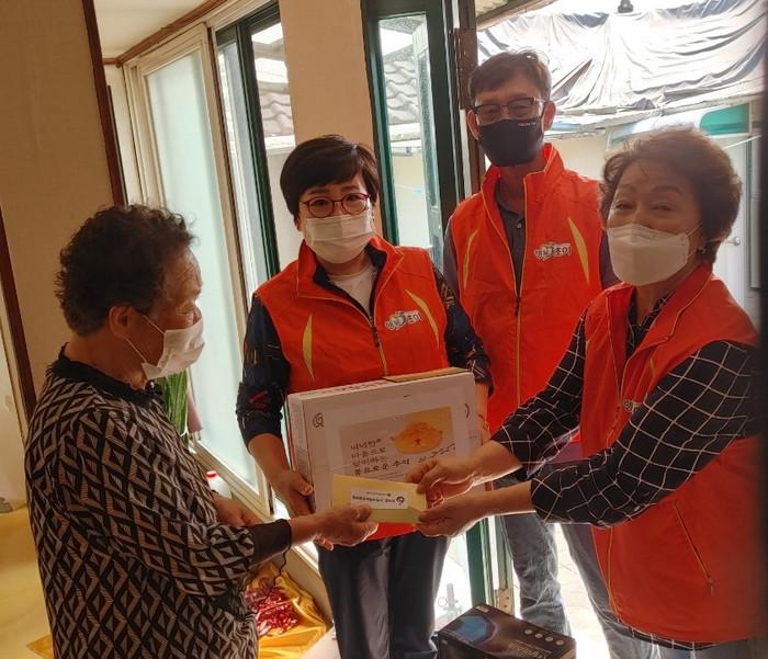 경기 하남시 초이동 지역사회보장협의체는 최근 추석을 맞아 사회복지공동모금회 지정기탁금 430만원을 활용해 복지사각지대 43가구에 농협상품권(5만원)과 쌀(10kg) 등 선물꾸러미를 전달했다. 사진은 협의체 위원들이 대상가구에 선물을 전달하고 있는 모습. (사진제공=하남시청)