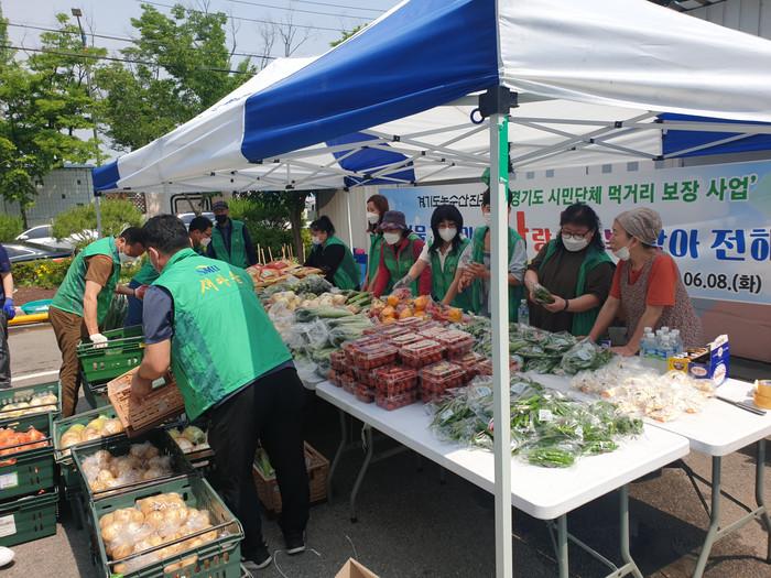 경기 안산시 새마을회와 월피동 새마을회가 지난 15일 올해 세 번째 ‘행복한 밥상을 위한 우리 농산물 꾸러미 나눔 행사’를 개최했다. 그동안 홀몸노인·다자녀 140가구에 1·2차에 걸쳐 전달됐으며, 이번 나눔에는 장애·다문화 60가구를 대상으로 농산물 꾸러미(쌀·감자 등)가 전달됐다. 사진은 이날 참여한 봉사자들이 행사를 준비하고 있는 모습. (사진제공=안산시청)