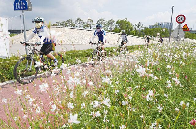 한풀 꺾이며 맑은 날씨가 이어지고 있는 18 오전 서울 서초구 반포한강시민공원에서 시민들이 자전거를 타고 있다.