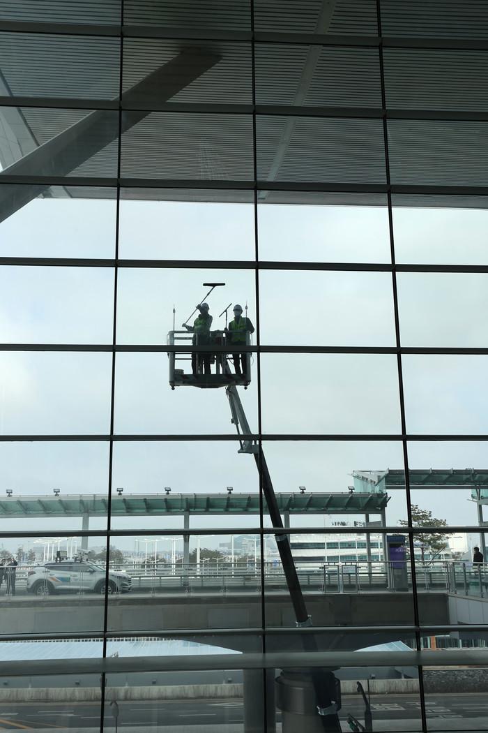 25일 오전 인천국제공항 2터미널에서 관계자들이 외벽 청소를 하고 있다.