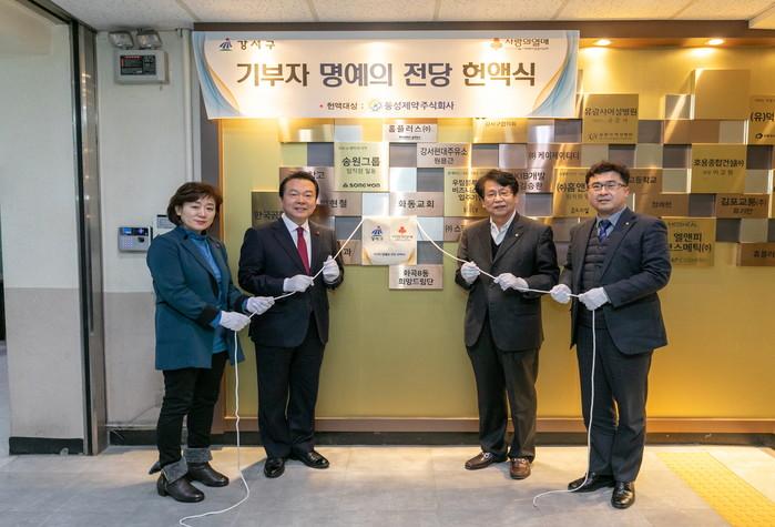 서울 강서구는 13일 구청장실에서 동성제약으로부터 지역내 저소득 소외계층을 위한 1억원 상당의 바이오가이아 유산균 제품을 기탁받고 명예의 전당 헌액식을 했다. 사진은 노현송 구청장(왼쪽에서 두 번째)과 관계자들이 기념촬영을 하는 모습. (사진제공=강서구청)