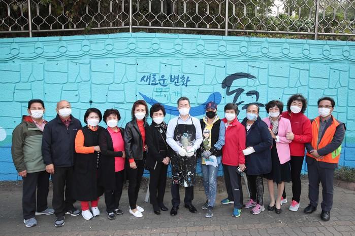 인천 동구 자원봉사센터는 최근 이틀간 인천광역시자원봉사센터와 동구청 지원으로 송현동 산업고가도로 밑 외벽에 ‘담장벽화 그리기 사업’을 실시했다. 이번 사업은 산업고가도로 밑 외벽을 쾌적한 공간으로 바꿔 안심길로 조성하기 위해 이뤄졌다. 사진은 격려차 방문한 허인환 구청장(가운데)과 봉사자들이 기념촬영을 하고 있는 모습. (사진제공=동구청)