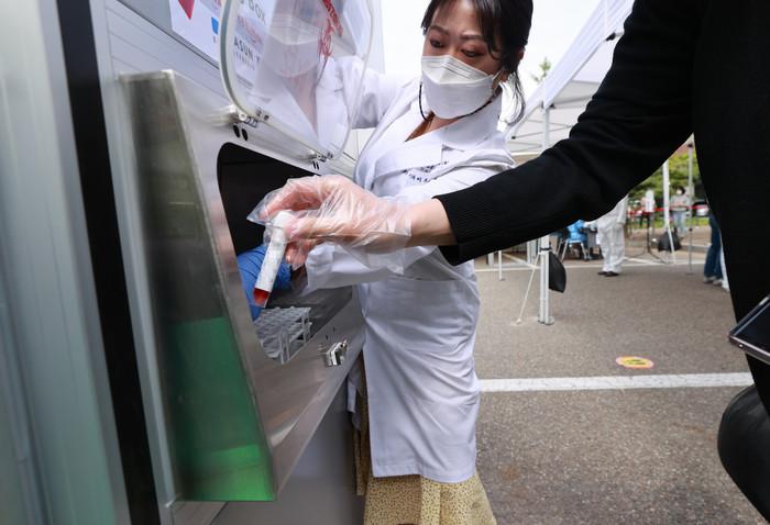 26일 오전 서울 관악구 서울대학교 자연과학대 앞에서 이 대학교가 도입한 코로나19 신속 분자진단 검사를 받은 학생이 검사를 마친 뒤 검체를 보관함에 넣고 있다.