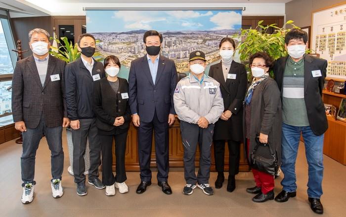 서울 용산구가 22일 ‘옛 사진 공모전’ 우수작 시상식을 개최해 최우수상(노용하씨), 우수상(박인규·김정인씨), 장려상(강은지·고동연씨)을 시상했다. 사진은 시상식에서 성장현 구청장과 수상자들이 기념촬영을 하는 모습. (사진제공=용산구청)