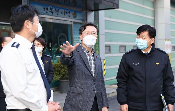 채현일 영등포구청장은 최근 구 안전교통국장과 함께 영등포소방서를 찾았다. 이날 채 구청장은 안전사고 예방과 선제적 대응에 밤낮없이 수고하는 소방대원을 위해 준비한 간식을 전달하고, 구청장 명의의 감사패도 전달했다. 사진은 채 구청장(가운데)과 권태미 영등포소방서장(왼쪽)이 이야기를 나누고 있는 모습. (사진제공=영등포구청)