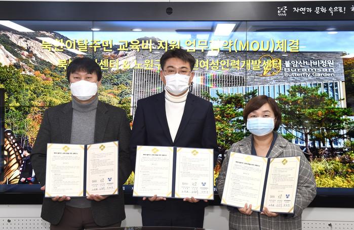 서울 노원구가 최근 서울북부하나센터·노원여성인력개발센터와 북부이탈주민 교육지원 관련 업무협약을 체결했다. 협약을 통해 구는 북한이탈주민 교육지원을 위한 사업계획 수립과 예산지원, 서울북부하나센터는 수강생 모집·사후관리, 여성인력개발센터는 위탁교육을 진행한다. 사진은 협약식에서 오승록 구청장(가운데)이 관계자들과 기념촬영을 하는 모습. (사진제공=노원구청)