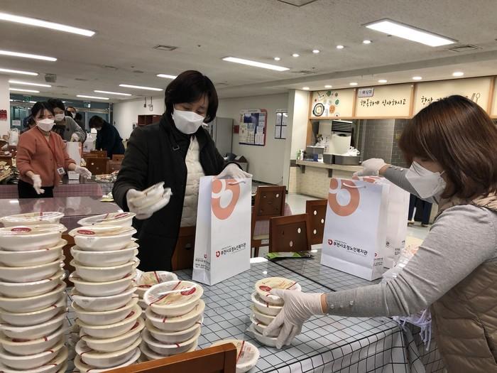 경기 부천시가 코로나19 확산으로 인해 어려움을 겪고 있는 지역내 취약계층 노인을 대상으로 최근 대체 간편식을 배부하고 감염병 예방 지도·점검과 함께 건강을 살폈다. 사진은 노인들에게 배부할 간편식을 포장하고 있는 시 직원들의 모습. (사진제공=부천시청)