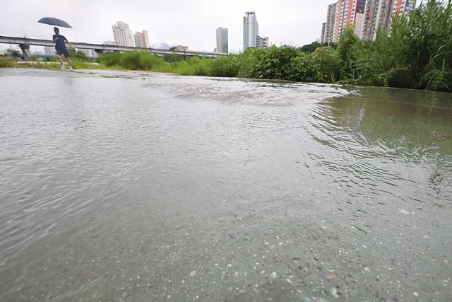 서울 동북권에 호우주의보가 발효된 19일 오전 서울중랑구 중랑천 산책로가 물에 잠겨 있다.