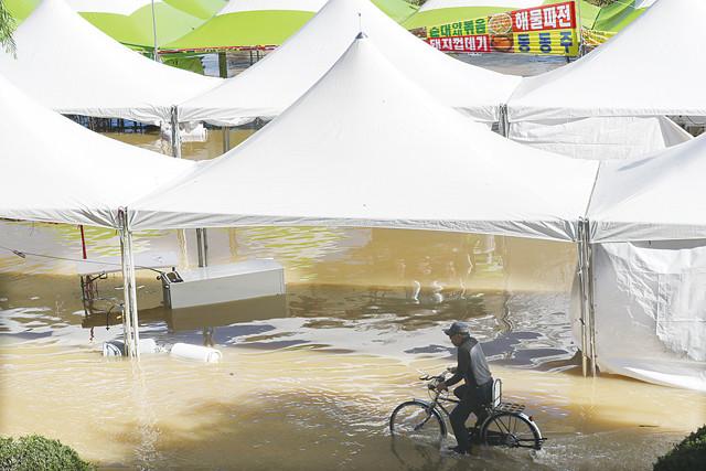 폭우로 잠긴 축제장… 냉장고·가스통 둥둥