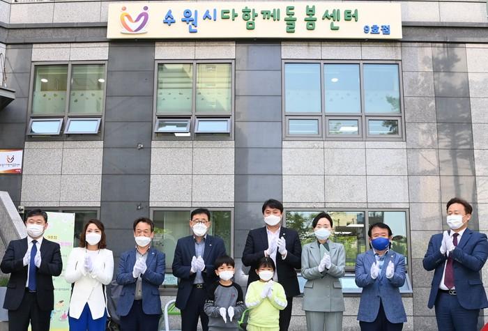 경기 수원시는 3일 권선구 오목천동 수원권선 꿈에그린아파트에 ‘수원시 다함께돌봄센터 9호점’ 개소식을 열었다. 다함께돌봄센터는 모든 초등학생을 대상으로 돌봄 서비스를 제공하는 시설이며, 9호점은 프로그램실(2개)·교사실·조리실 등을 갖추고 있으며, 정원은 30명이다. 사진은 개소식에 참가한 관계자들이 박수를 치고 있는 모습. (사진제공=수원시청)