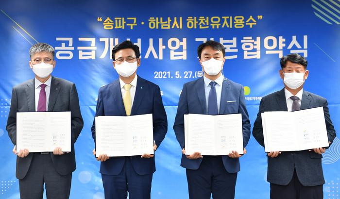 경기 하남시는 27일 서울 송파구·서울주택도시공사·한국토지주택공사와 '송파구, 하남시 하천 유지용수 공급개선사업 기본 협약'을 체결했다. 협약은 ‘송파구, 하남시 하천 유지용수 공급개선사업’에 대한 각 지자체와 공기업의 역할·책임 등 사업추진 기본사항 등이 내용이다. 사진은 협약식에서 김상호 시장(오른쪽 두 번째)과 관계자들이 기념촬영을 하는 모습. (사진제공=하남시청)