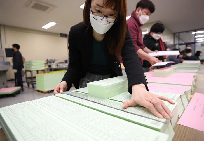 31일 오후 대구시 달서구의 한 인쇄업소에서 인쇄된 4.15 총선 비례대표 투표용지가 48.1cm의 길이를 보이고 있다.