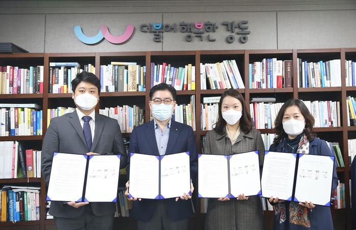 서울 강동구는 지난 28일 오랄-비·테라사이클·쿨시티강동네트워크와 함께 폐칫솔을 모아 줄넘기·플라스틱 화분 등 새로운 제품으로 탄생시키는 친환경 프로젝트 ‘블루우체통 캠페인’ 업무협약을 맺었다. 사진은 업무협약식에서 이정훈 구청장(왼쪽에서 두 번째)이 관계자들과 기념촬영을 하고 있는 모습. (사진제공=강동구청)