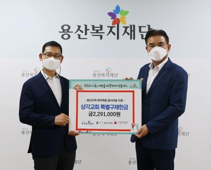 서울 용산복지재단은 최근 지역내 삼각교회로부터 코로나19 장기화로 인해 어려움을 겪고 있는 취약계층 아동을 위한 결식아동돕기 성금(229만원)을 기부받았다. 사진은 전달식에서 관계자들이 기념촬영을 하고 있는 모습. (사진제공=용산구청)