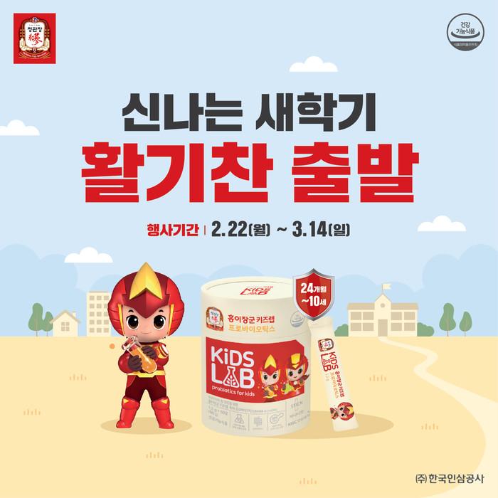 [시민일보 = 고수현 기자] KGC인삼공사가 다가오는 신학기를 맞아 '홍이장군 키즈랩 프로바이오틱스 7천명 쏜다' 이벤트 등 다양한 프로모션을 오는 3월14일까지 진행한다.