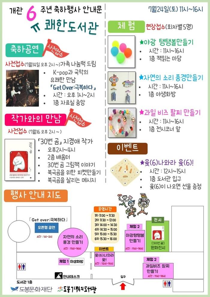 [시민일보 = 여영준 기자] 서울 도봉구(구청장 이동진) 도봉기적의도서관이 오는 24일 개관 6주년 기념 축하 행사 ‘유(6)쾌한 도서관’을 개최한다.