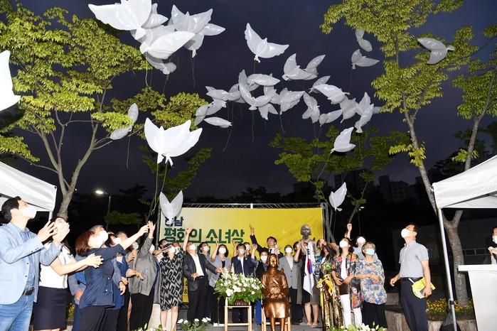 경기 하남시가 최근 일본군 위안부 피해자 기림의 날을 맞이해 시 국제자매도시공원에서 ‘하남 평화의 소녀상 건립 1주년 기념행사’를 개최했다. 사진은 이날 김상호 시장을 비롯한 참석자들이 평화의 비둘기 풍선을 하늘에 날리고 있는 모습. (사진제공=하남시청)