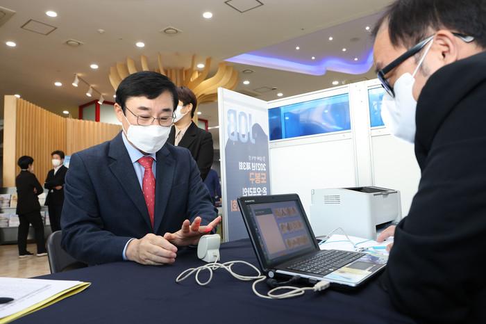 이동진 도봉구청장은 지난 29일 열린‘2021년 제3회 도봉구 일자리 박람회’에 참석해 현장 면접장소·적성검사 부스 등을 둘러보고 박람회에 참석한 지역 주민들과 인사를 나눴다. 사진은 이 도봉구청장(왼쪽)이 적성검사를 체험하고 있는 모습. (사진제공=도봉구청)