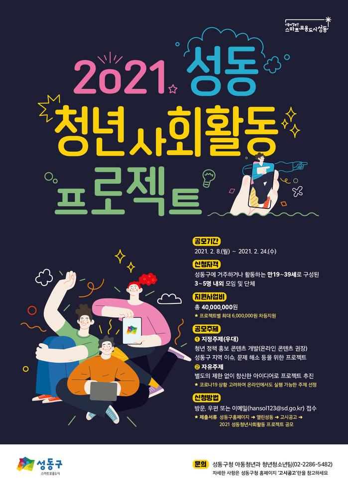 [시민일보 = 홍덕표 기자] 서울 성동구(구청장 정원오)가 오는 24일까지 '2021년 청년사회활동프로젝트'에 참여할 청년을 모집한다.