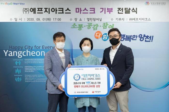 서울 양천구는 지난 1일 (주)에프지아크스로부터 코로나19 극복을 위한 마스크(2000만원 상당)를 전달받았다. 마스크는 양천사랑복지재단을 통해 긴급돌봄 중인 어린이집 교사들에게 지원할 예정이다. 사진은 기탁식에서 김수영 구청장(가운데)과 관계자들이 기념촬영을 하고 있는 모습.(사진제공=양천구청)