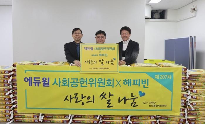 올해 첫 활동은 ‘사랑의 쌀’ 나눔이었다. 에듀윌 사회공헌위원회는 지난 1월 사랑의 쌀 100포대를 강남구 노인통합지원센터에 기증했다.