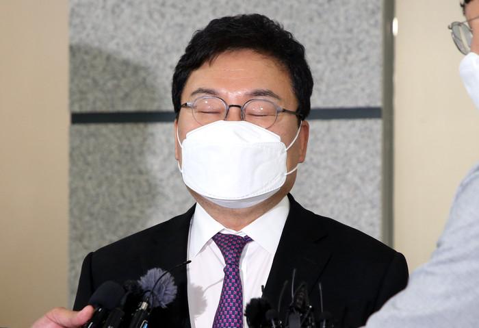 이스타항공 창업주로서 '횡령·배임 혐의'를 받는 무소속 이상직 의원이 27일 전북 전주지법에서 열린 구속 전 피의자 심문(영장실질심사)에 출석해 취재진의 질문을 듣고 있다.