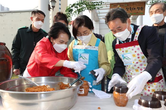 은평구 진관동 주민센터는 최근 주민센터 옥상에서 보리쌀효소 된장나눔 행사를 진행했다. 이번 행사는 5개월 동안의 발효·숙성 기간을 거친 명품 보리쌀효소 된장을 첫 개시하고 소외된 이웃들에게 전달할 된장 소분 및 간단한 시식회 순으로 진행했다. 사진은 행사에 참여한 김미경 구청장(가운데)이 된장을 용기에 담고 있는 모습. (사진제공=은평구청)