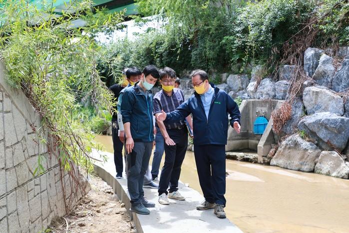 조광한 경기 남양주시장이 지난 11일 휴일 정책투어로 '화도읍 마석우천 그린웨이 조성사업' 현장을 방문했다. 이날 조 시장은 이 사업과 관련해 산책로의 폭이 좁다는 민원을 제출한 주민들을 만나 의견을 듣고 담당 공무원들과 함께 현장 상황을 점검했다. 사진은 현장을 둘어보는 조 시장(오른쪽)의 모습. (사진제공=남양주시청)