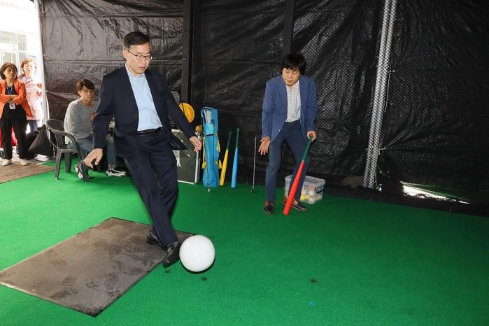 금천구는 최근 구청 광장 및 금나래 공원 일대에서 ‘금천, 미래를 탐(탐험, 탐구, 탐색)하다! G-Science Day’를 주제로 ‘2019 금천 과학 페스티벌’을 개최했다. 사진은 VR체험부스에서 유성훈 구청장이 축구게임을 체험하고 있는 모습. (사진제공=금천구청)