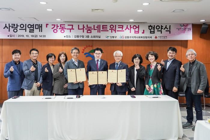 강동구가 최근 서울 사회복지공동모금회, 강동구지역사회보장협의체와 함께 ‘사랑의열매 강동구 나눔네트워크’ 협약식을 열고 협약을 맺었다. 사진은 협약 후 기념촬영을 하고 있는 이정훈 구청장(가운데)와 관계자들의 모습. (사진제공=강동구청)