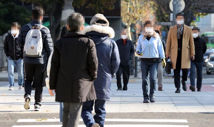 아침 체감온도가 영하권으로 떨어진 23일 오전 서울 종로구 광화문사거리에서 시민들이 발걸음을 옮기고 있다.