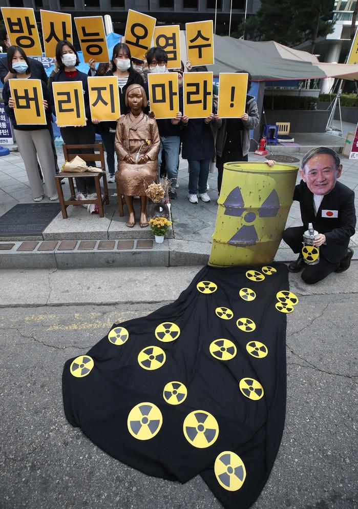 19일 오전 서울 종로구 옛 일본대사관 앞 평화의소녀상에서 환경운동연합 활동가 등이 '후쿠시마 방사성 오염수 해양방류 결정 반대'기자회견을 열고 스가 총리 가면을 쓴 활동가가 방사성 오염수의 방류를 반대하는 퍼포먼스를 하고 있다.