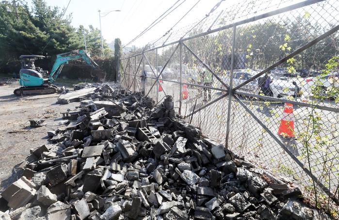 인천시가 부평미군기지 '캠프마켓' 일부를 시민에 개방하는 방안을 추진하는 가운데 6일 오전 인천시 부평구 캠프마켓 일부 담벼락이 철거되고 있다. 인천시는 캠프마켓 반환 부지 21만㎡ 가운데 환경 정화에 지장이 없는 4만2000㎡ 주변에 경계 펜스를 설치하고 이달 14일께 시민에 개방할 계획이다.