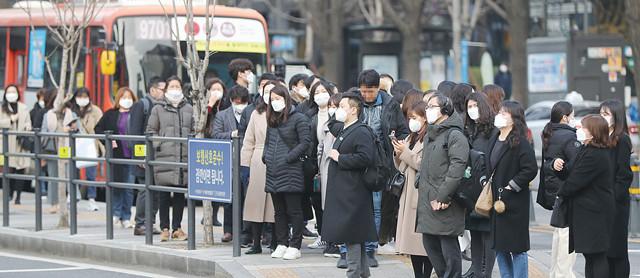 24일 서울 광화문역 사거리 횡단보도에서 시민들이 코로나 19 예방 등의 이유로 마스크를 착용하고 출근하고 있다.