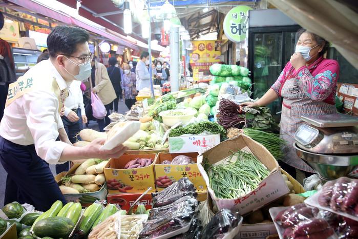 이정훈 강동구청장이 22일 추석을 앞두고 둔촌역 전통시장을 방문해 코로나19로 어려움을 겪고 있는 상인들을 격려하고 위축된 전통시장 활성화에 힘을 보탰다. 사진은 이 구청장(왼쪽)이 한 상인과 대화를 나누고 있는 모습. (사진제공=강동구청)