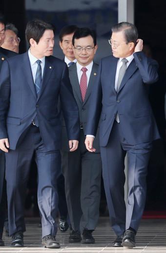아세안+3 정상회의 참석차 출국하는 문재인 대통령이 3 오전 서울공항에서 더불어민주당 이인영 원내대표 환송 인사들과 함께 공군1호기로 이동하고 있다.