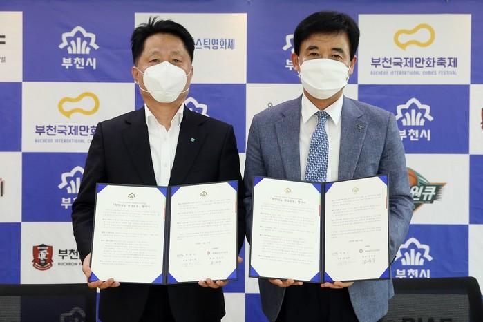 경기 부천시가 지난 24일 사단법인 희망을나누는사람들과 '2020년 희망나눔 연결운동' 협약을 체결했다. 이날 협약에 따라 희망을나누는사람들은 취약계층 아동·청소년 24명에게 1600만원 상당의 장학금과 컴퓨터를 지원하고 총 4억원 상당의 생필품도 함께 배분할 예정이다. 사진은 장덕천 시장(왼쪽)과 김정안 회장이 기념촬영을 하는 모습. (사진제공=부천시청)