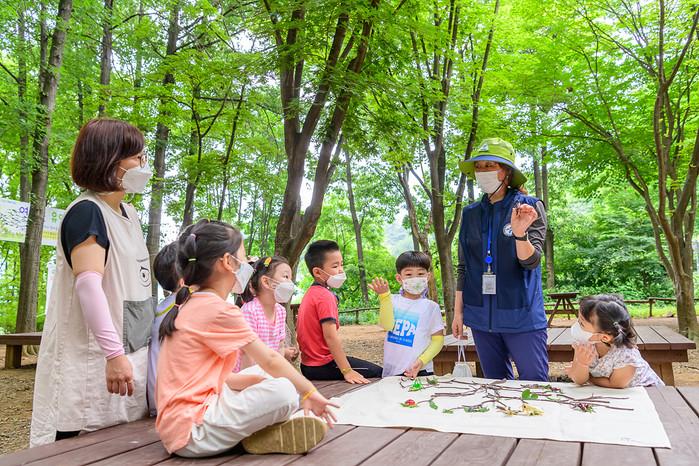 서울 양천구가 최근 신정동 계남근린공원 유아숲 체험원에서 ‘나무 하나에’ 함께 사는 생물을 탐구하는 수업을 진행했다. 이날 참여한 어린이들은 지역내 동화책 <나무 하나에>를 읽고 유아숲 체험원의 나무에 사는 곤충의 몸구조와 특징 등을 배웠다. 사진은 유아숲지도사가 나무 하나에 수업을 진행하고 있는 모습. (사진제공=양천구청)