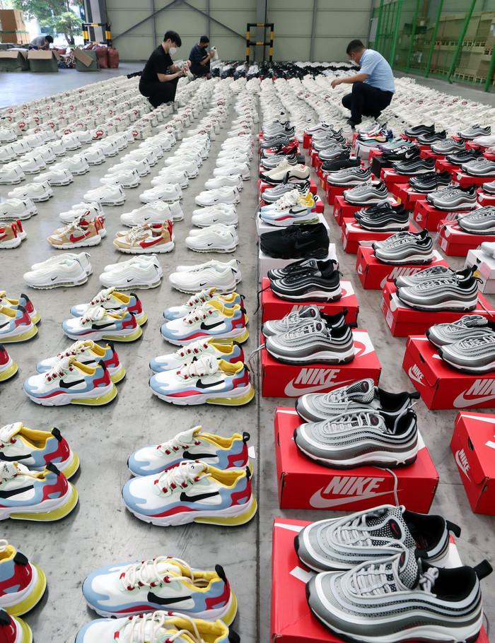 26일 부산 강서구 부산세관신항지정장치장에서 직원이 해외 유명 브랜드 제품을 본떠 만든 중국산 '짝퉁' 운동화 압수품을 공개하고 있다. 부산본부세관은 나이키, 구찌, 발렌시아가 등 해외 유명 브랜드 위조 상표 운동화 2000켤레(정품 시가 17억원어치)를 밀수입해 유명 오픈마켓에서 정품인 것처럼 판매한 일당 3명을 붙잡아 1명을 구속했다고 밝혔다.