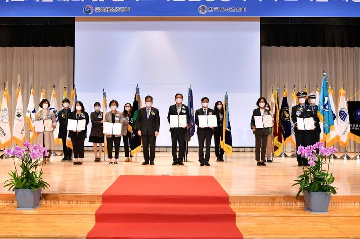 금천구립시흥도서관이 ‘2020 전국도서관 운영평가’에서 공공도서관 우수기관으로 선정돼 국무총리 표창을 받았다. 사진은 지난 28일 제57회 전국도서관대회 온라인 개막식에서 금천구립시흥도서관 김은진 관장(왼쪽에서 두 번째)이 국무총리 표창을 수상한 뒤 기념촬영을 하는 모습. (사진제공=금천구청)