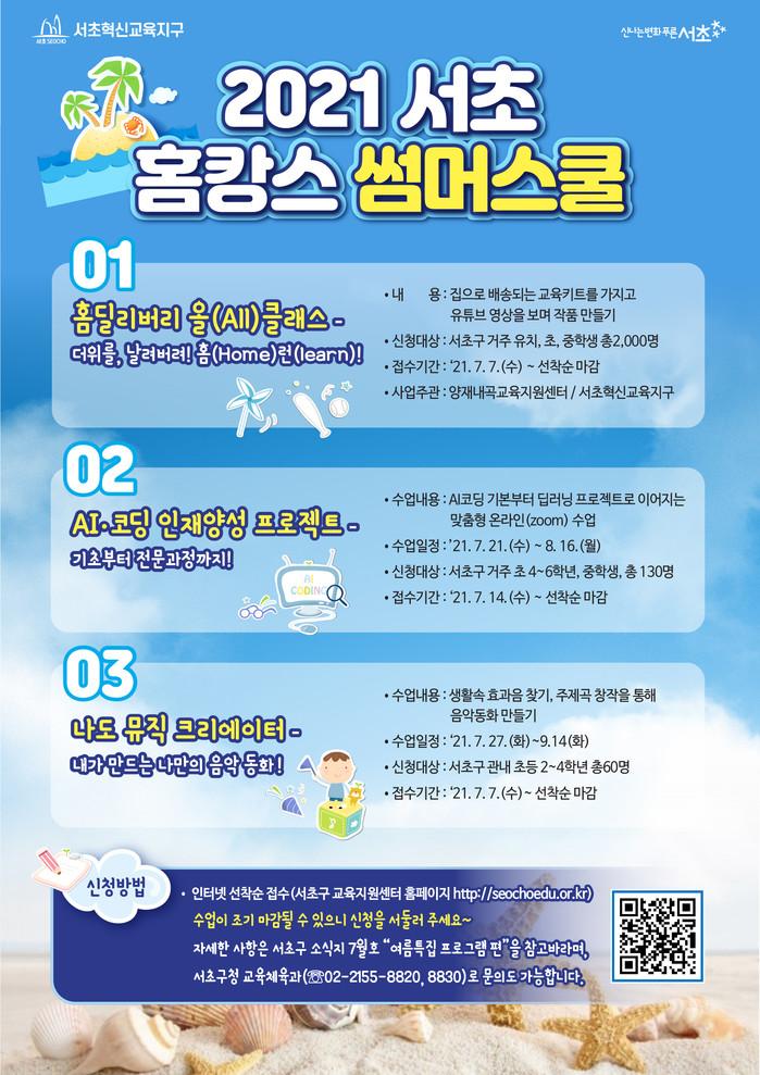 [시민일보 = 이대우 기자] 서울 서초구(구청장 조은희)가 다가오는 여름방학을 맞아 이달부터 지역내 학생들을 대상으로 ‘2021 서초 홈캉스 썸머스쿨’을 운영한다.