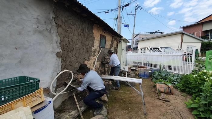경기 양평군 옥천면지역사회보장협의체는 최근 옥천리에 거주하는 94세 노인 가구를 대상으로 ‘우리 집 깔끔 DAY’ 사업을 추진했다. 이번 봉사는 주택의 흙벽이 떨어지고 벌어져 벽을 보수하는 방향으로 진행됐다. 사진은 무너질 위험이 있는 대상가구의 벽을 보수하고 있는 모습. (사진제공=양평군청)